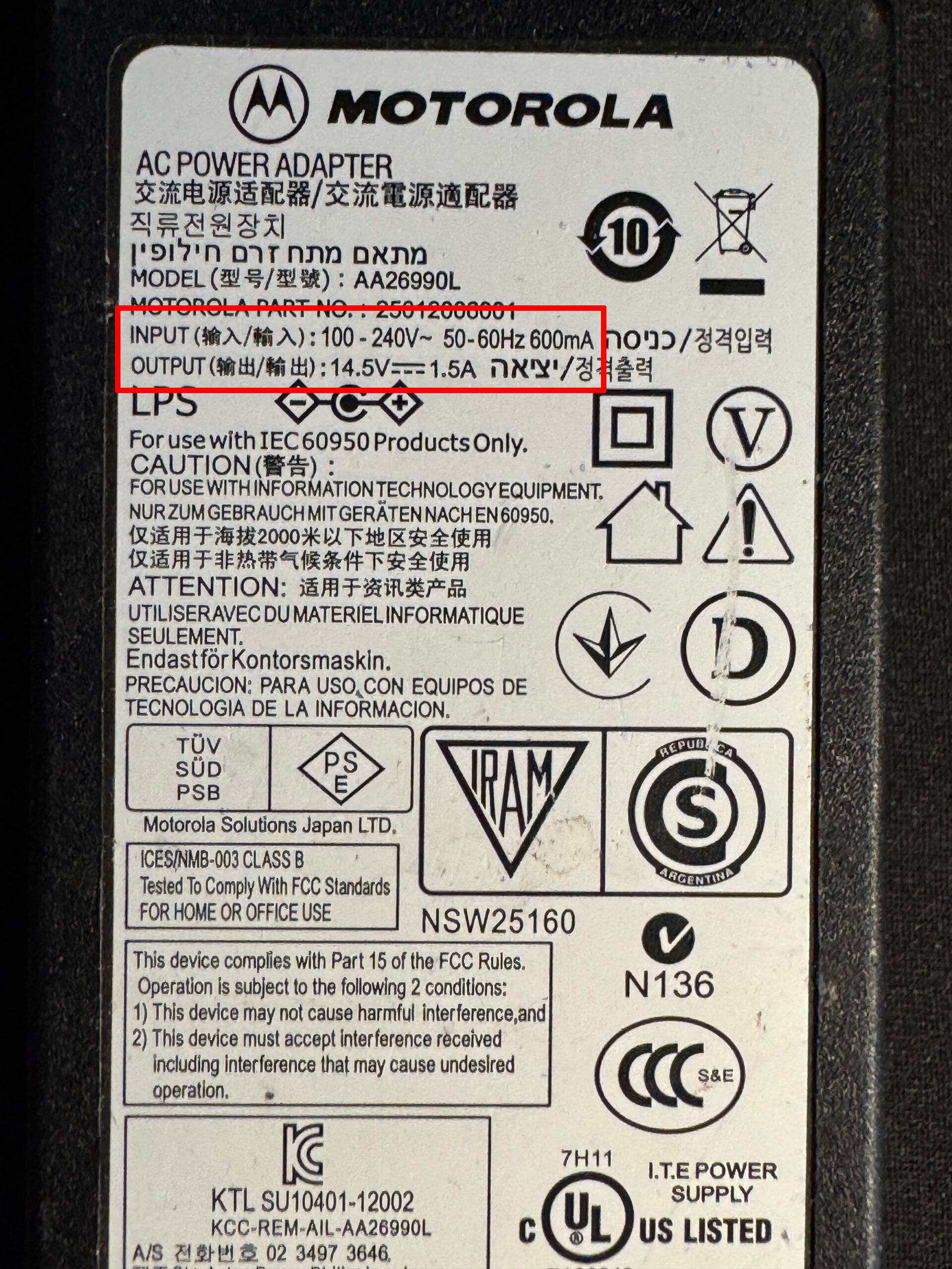A jak sprawdzić taki zasilacz czy nadaje się do ładowania w przypadku gniazda DC ? Bardzo prosto, wystarczy zerknąć na opis na zasilaczu, każdy zasilacz musi mieć podaną tabele napięć jakie generuje dany zasilacz. Tutaj posłużę się zasilaczem od radiotelefonu Motorola: